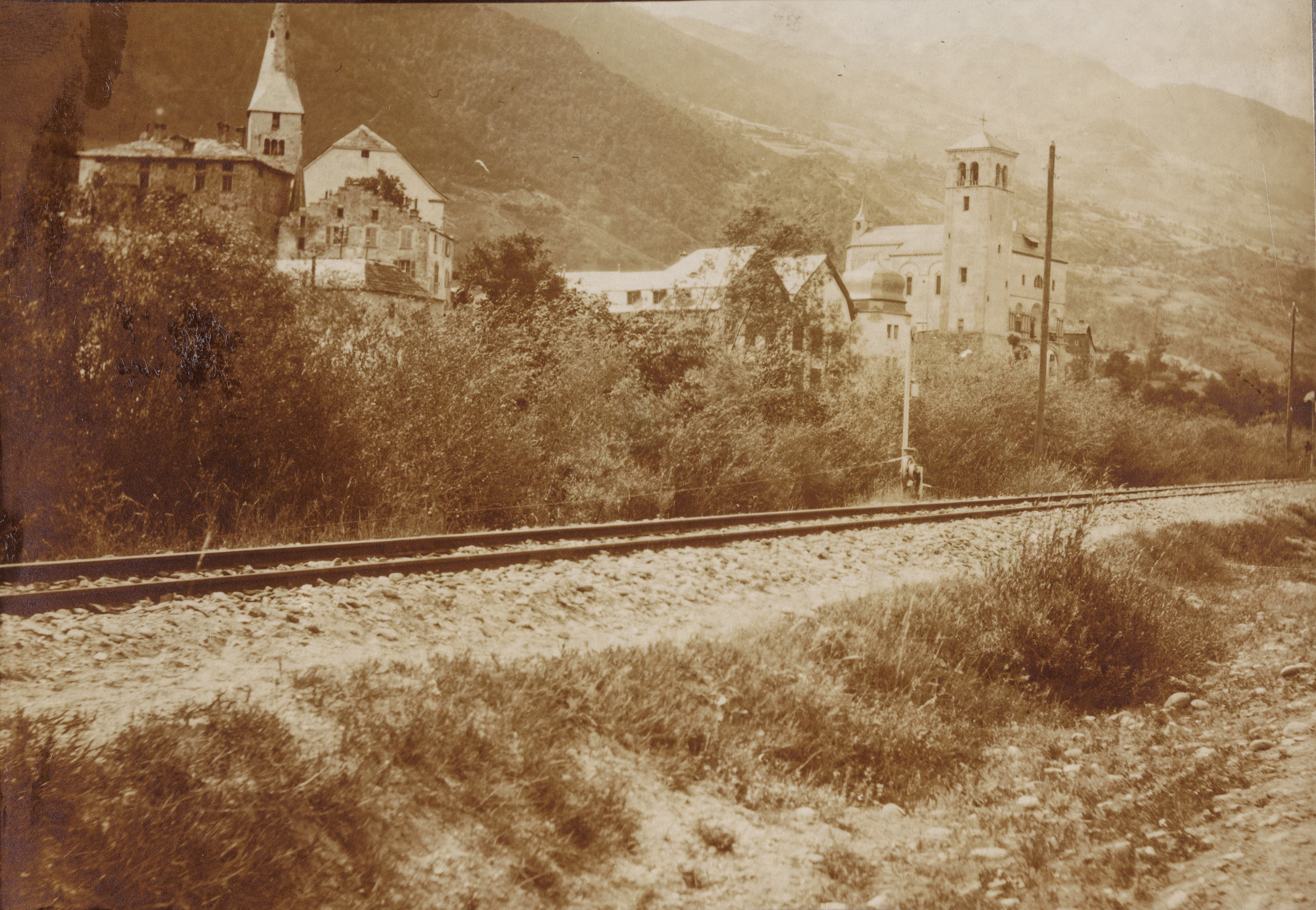 Aufnahme von 1910, im Vordergrund der Damm mit dem Bahngleis ins Mattertal. In Visp hatten 1888 die Arbeiten für die Schmalspurbahn Visp-Zermatt (VZ) begonnen, nachdem die Bundesbehörden 1886 die Konzession für den Bau erteilt hatten. Das rechte, östliche Ufer der Vispa gegen die Siedlung hin wurde durch den Bau des Damms für die Visp-Zermatt-Bahn wesentlich sicherer. 1890 fuhr der erste Zug nach Stalden, 1891 wurde Zermatt erreicht. Zunächst beschränkte sich der Betrieb auf den Sommer.
